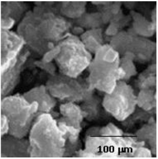 Methyl methacrylate (MMA) monomer was obtained from (Merck, Darmstadt, Germany). Hydrophilic nanosilica of 7 nm diameter (Aldrich, St. Louis, MO, USA) was used as a thixotropic agent and anticorrosive material [11,12]. Nanoclay Halloysite nanotubules (HNTs) were purchased from (Aldrich), with an average tube diameter of 50 nm and inner lumen diameter of 15 nm [13]. Stone sludge fillers (SSF) were produced by successive sieving of the sludge of natural stones such as marble, basalt, and granite. The average particle diameter of SSF was about 50 μm as determined by SEM micrograph presented in Figure 1.