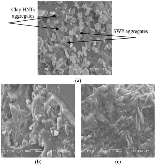 SEM micrographs of Granite/PMMA/clay HNTs nanocomposites impregnated with different SSF concentrations (a) 10 wt %, (b) 60 wt % compared to (c) natural granite.