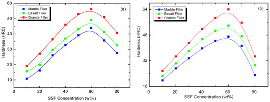 Effect of SSF concentration on the Rockwell hardness of acrylic solid surface nanocomposites (a) PMMA/SiO2/SSF and (b) PMMA/clay HNTs/SSF.