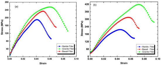 Flexural stress-strain curves of acrylic solid surface nanocomposites. (a) PMMA/SiO2/SSF and (b) PMMA/clay HNTs/SSF.