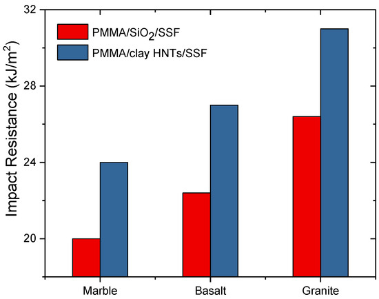 The effect of nanoparticle type on the impact strength of acrylic solid surface nanocomposites is plotted in Figure 6. It is noticed that the impact strength for PMMA/SSF/clay HNTs is higher than that PMMA/SiO2/SSF nanocomposites. In addition, the maximum value of the impact resistance was 31 kJ/m2 obtained for granite stone fillers. This could be due to the high impact strength of granite compared to marble and basalt besides the excellent compatibility between PMMA/HNTs nanocomposite and granite sludge.