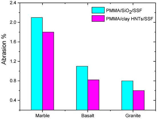 The abrasion resistance of acrylic solid surface nanocomposites was estimated according to ASTM (D1044-08e1). Figure 7 illustrates the percentage weight loss due to surface abrasion for all the prepared acrylic solid surface nanocomposites. It is noticed that the abrasion resistance is increased for the nanocomposites containing clay HNTs compared to those containing nanosilica. This advantage is a result of clay HNTs which are excellent non-corrosive materials which provide a substantial increase in the scratch resistance [24]. It is also observed that granite sludge fillers are the best candidate for scratch resistant acrylic solid surface nanocomposites because granite stones are rich in highly scratch resistant crystalline phases [25].