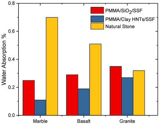Water absorption was measured for solid surface nanocomposites after 24 h of soaking at normal atmospheric conditions according to ASTM (D570-98e1), the values are presented in Figure 8 compared to that of natural stones. It is clearly observed that the water absorption for acrylic solid surface nanocomposites based on clay HNTs is lower than those based on nanosilica. This can be attributed to the fact that polymer HNTs have a larger longitudinal size compared to spherical nanosilica and consequently a longer penetration distance in the resulting nanocomposite [5]. As a result of this phenomenon, the filler stones are protected from water diffusion after being completely saturated by PMMA nanocomposite solutions during the polymerization process. Moreover, the addition of both ATH and the cross-linking agents decreased the free volume of PMMA and prevented the presence of voids in the prepared matrix.