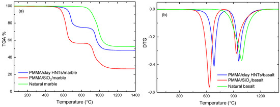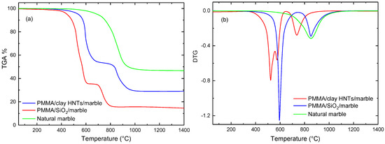 Effect of nanofiller type on thermogravimetric analyzer (TGA) (a) and derivative of the thermograms (DTG) (b) curves of marble solid surface nanocomposites (compared to natural marble).