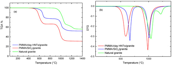 Effect of nanofiller type on TGA (a) and DTG (b) curves of Granite solid surface nanocomposites (compared to natural granite).