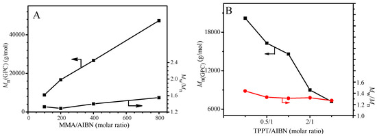 In order to test other two characteristics of the livingness, the GPC was used to follow the polymerization of MMA in the presence of TPPT and the results are shown in Figure 1B. The plots of the Mn(GPC) and Mw/Mn against conversion in Figure 1B display relatively high molecular weight of the resultant PMMA at the beginning of polymerization and almost no variation of the molecular weight with the conversion, which is attributable to hybrid behavior in the previous report [37]. Because of high stability of the chain radical III, the addition reaction of the propagating radicals with the TPPT is more rapid relative to its reversible reaction (very low kf1 in reaction Equation (5)), so, obvious regeneration of the growing chain radicals is not observed. In addition, due to high steric hindrance of both the chain radical III and the growing PMMA radical, the cross-termination of the chain radical III with the primary radical is absolutely predominant in the competition reactions of the radical III with the growing PMMA radical or the primary radical. Reversible reaction of the dormant chains IV yields the chain radicals III and the primary radicals, the latter initiates the polymerization of MMA forming new chains or reacts with the radical III, so, regeneration of the growing chain radical is impossible. As we know, in the controlled radical polymerizations, prerequisite for controlling over the chain growth is regeneration of the growing chain radicals. Therefore, this unusual behavior is attributed to high stability and high steric hindrance of the chain radical III leading to termination of the chain propagation and almost immovability of the molecular weight with monomer conversion. Although relationship between the molecular weight and the conversion is similar to the conventional radical polymerization, polydispersities of the resultant PMMAs are relatively narrow and their polydispersity indices vary in between 1.19 and 1.27 during 24 h of polymerization (Figure 1B and Figure S2B). The polydispersity difference from the conversional radical polymerization is probably due to a different polymerization mechanism. In the conventional radical polymerization, the molar ratio of monomer to initiator is a main factor influencing the chain length, however, the main factor in the present system is molar ratio of [monomer]/[TPPT]/[initiator] when the temperature is fixed. As shown in Figure 2A, molecular weights of the obtained PMMA increase from 8800 g/mol to 47,000 g/mol when the molar ratios of MMA/AIBN increase from 100 to 800 because this ratio increases, it infers the decrease of AIBN and TPPT concentrations in the monomer solution, which leads to an increase of the PMMA chain growth rate. The molar ratio of TPPT/AIBN also affects the molecular weights of polymer obtained. When the molar ratios of TPPT/AIBN increases from 0.25 to 4, the molecular weights of PMMA formed decrease (Figure 2B) because this ratio increase will increase the possibility of PMMA radicals terminated by TPPT, reducing the life time of growing chain radicals.
