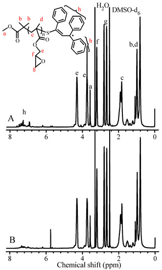 As aforementioned in the discussion on Figure 1B, almost no variation of molecular weight with conversion is due to negligible reversible reaction (kf1) of the intermediate chain radical III to form the growing chain radical and TPPT during the polymerization. It is necessary to clarify whether this reversible reaction (kf1) exists, if it exists, in what condition can this reaction occur? Therefore, the obtained PGMAs were characterized, and their 1H NMR spectra of PGMA are shown in Figure 5. The results evidence the addition reaction (ka1) of growing chain radicals with TPPT, the epoxy methylene (g), epoxy methine (f), and ester methylene (e) proton signals of the glycidyl group in PGMA respectively appear at δ = 2.79, 2.66 (g); 3.19 (f) and 4.32, 3.74 (e), the proton signals at δ = 3.58 (a) and 6.75~7.52 ppm are respectively attributed to the ester methyl protons (a) of the AIBME, aromatic and allylic protons (h) of the TPPT, ascription of other proton signals is marked in Figure 5. Existence of the isobutyronitrile and the TPPT in the PGMA chains demonstrates that the initiation of AIBME and the addition reaction between the growing chain radicals and TPPT are really taken place to form intermediate chain radical III (see reaction Equation (5)). However, when we compare 1H NMR spectra of the PGMAs obtained from different dissolution-precipitation cycles for purification of the polymer, we always observe decrease of the proton signals appeared in the range of 6.74 and 7.5 ppm with increase of the dissolution-precipitation cycle. Figure 5A,B are the 1H NMR spectra of the PGMA obtained respectively after one and three dissolution-precipitation cycles of the PGMA formed in the polymerization with the feed molar ratio of GMA/TPPT/AIBME = 10/2/1 at 70 °C for 24 h. Because the monomer unit cannot be lost during the purification, the integration ratio of proton signal e to signals h [Ie/(Ih/16)] is used to identify the change of TPPT content in the PGMA. For the PGMA obtained after one dissolution-precipitation (in methanol) cycle, this ratio is 55.4, that is, the TPPT content is 1.8%. However, after three dissolution-precipitation cycles, the proton signals h at 6.74~7.5 ppm obviously decrease as shown in Figure 5B [Ie/(Ih/16) = 86.9], and the TPPT content reduces from 1.8% to 1.1%. The TPPT content decrease implies that the equilibrium reaction 5 reversibly shifts from the intermediate chain radical III to the growing chain radical and TPPT, and the regenerated TPPT is removed during the polymer purification process, so, the TPPT content in the PGMA decreases, and more dissolution-precipitation cycles result in more low TPPT content in the polymers. Thus, the molecular weight of PGMA separated from the polymerization solution cannot be calculated based on 1H NMR data, more specifically, the integration ratio of proton signal e to signal h because some PGMA chains do not contain one TPPT unit due to precipitation process. Here, some reasonable questions arise, are those PGMA chains without TPPT unit produced during the polymerization and/or during the polymer purification and the storage? How can the intermediate chain radical III regenerate the growing chain radicals?