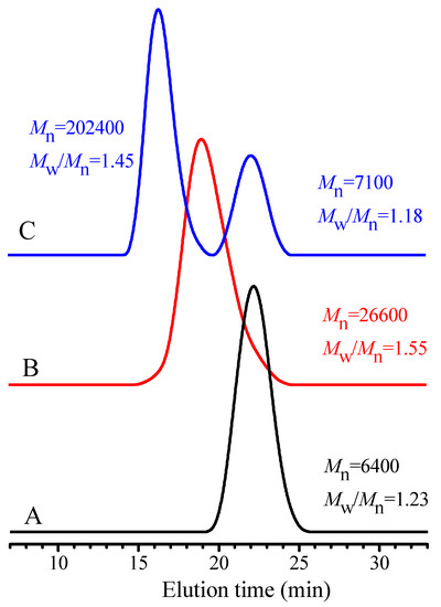In order to answer the above questions, two polymerizations of the MMA with the same feed molar ratio of MMA/TPPT/AIBN = 50/2/1 were separately carried out at 70 °C in the two reaction tubes. After 24 h polymerization, the second monomer, GMA was directly added into one reaction tube for chain extension polymerization of the formed PMMA. The polymerization in another tube was stopped and the formed PMMA was obtained by precipitation in methanol for one time. Except a small amount of PMMA was used for GPC measurement, the residual PMMA was applied as extender in the subsequent polymerization of GMA. After both extension polymerizations were conducted at 70 °C for 12 h, the block copolymers were respectively obtained by precipitation in methanol, and the GPC traces of the block copolymer and their precursor are respectively shown in Figure 6A–C.