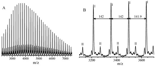 Matrix-assisted laser desorption ionization time-of-flight mass spectrometry (MALDI-TOF MS) spectrum (A) and enlarged spectrum (B) of the poly(glycidyl methacrylate) obtained by radical polymerization with feed molar ratio of GMA/TPPT/AIBN = 20/2/1 in anisole (concentration = 20 wt. %) at 70 °C for 24 h.