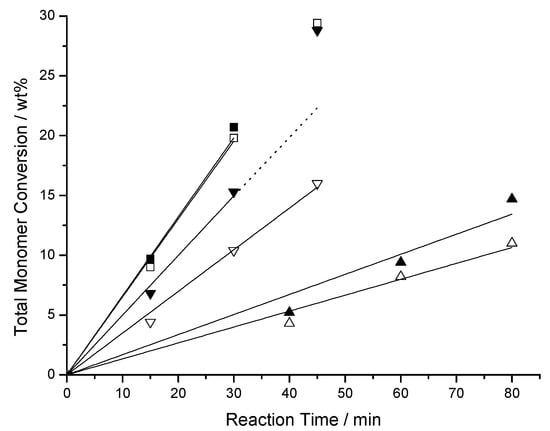 The experimental data for the copolymerization of the binary comonomer pairs BMA/MAH, F8H2MA/MAH, and F8H2MA/BMA (for two different monomer compositions) in all cases show a linear increase of the total monomer conversion with time up to conversions of ~12–20%, allowing to determine the initial weight rates of polymerization RPw,0 (Figure 1, Table 3).
