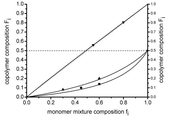 In the case that one of the monomers—for example, maleic anhydride (M3)—cannot be homopolymerized, two of the copolymerization parameters become zero and a modified equation that contains five copolymerization parameters can be used [9]. The parameter set consists of the “binary” parameters r12, r21, r13 and r23 that are experimentally accessible from binary copolymerization experiments with the three monomer pairs, as well as the parameter ρ that must be determined from the evaluation of a terpolymerization experiments (Equations (11)–(14)).