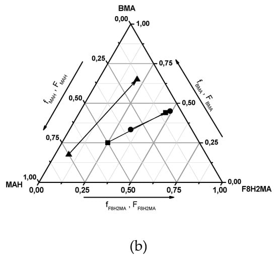 (a) Conversion time plots with BMA/F8H2MA/MAH mixtures ((1) ● = 1:1:1, (2) ■ = 1:1:2, (3) ▲ = 1.75:0.75:7.5); and (b) the corresponding terpolymerization diagram (the arrows connect monomer and terpolymer composition).