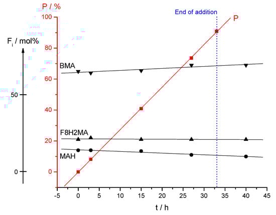 For the continuous addition experiment the monomer stock solution contained 75 mol % of MAH, 17.5 mol % of BMA and 7.5 mol % of fluorinated monomer (MAH:BMA:F8H2MA = 7.5:1.75:0.75). With such a monomer mixture experiments up to low conversion yielded copolymers (see Scheme 3) with acceptable composition with respect to MAH content and F8H2MA content of 14 and 21 mol % respectively. All parameters necessary to perform the continuous addition experiment were calculated according to the described method (for the details, see Experimental Section and Supplementary Materials).