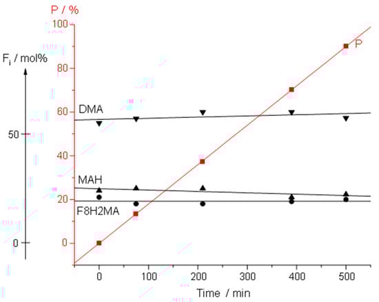 Change of the composition of C3 (P[F8H2MA-co-DMA-co-MAH]) terpolymer in time in continuous addition experiment. P, conversion; F, copolymer composition; MAH, maleic anhydride; DMA, dodecyl methacrylate; F8H2MA, 1H,1H,2H,2H-perfluorodecyl methacrylate.