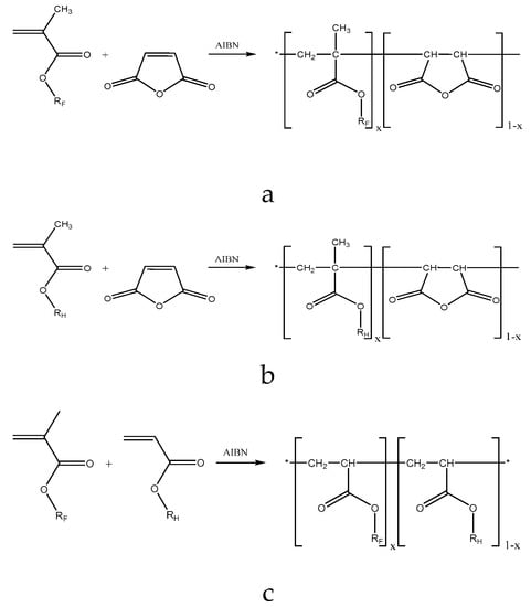 Investigated binary copolymers: (a) P[MAH-co-F8H2MA]; (b) P[MAH-co-RHMA]; and (c) P[RHMA-co-F8H2MA] with RH = C4H9– (= BMA), C12H25– (= DMA) and RF– = C10H4F19– (= F8H2MA).