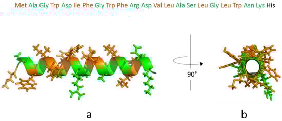 Amino acid sequence (top) and α-helical structure of the N-terminal amphipathic helix (AH) of Sar1: (a) side view from N-terminus (left) to C-terminus (right); and (b) view along the helix axis with the N-terminus in front. The colors code the amphipathicity according to a water/octanol partitioning scale [42,43] (orange: hydrophobic, green: hydrophilic). Side chains are shown only for hydrophobic (Ile, Leu, Phe, Met, Tyr, Trp, and Val) or hydrophilic (Arg, Lys, Glu, Asp, Asn, Gln, Ala, Gly, Ser, and Thr) amino acids.