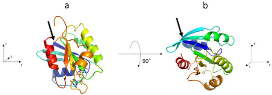 Structure of Sar1 as given in the pdb-file 1M2O, chain B [2]. The protein is shown within the pdb files coordinate system, which is depicted at the bottom of the figures and in two different representations: (a) looking along the positive y-axis; and (b) looking along the negative z-axis. The arrows indicate the N-terminus of the protein (Gly24), were the N-terminal amphipathic helix (AH) is attached. The AH is not part of the crystal structure and not shown in the figure.