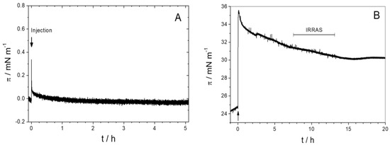 (A) Surface pressure versus time for the adsorption of the Sar1 23 mer N-terminal helix peptide to the air–buffer interface at a 100 nM peptide concentration starting with the injection of the appropriate volume of the stock solution into the subphase; (B) Injection of the AH peptide underneath an lipid monolayer (major-minor-mix, MMM) at t = 0 h. The peptide subphase concentration after injection is 100 nM. The time span, where Infrared-Refection-Absorption-Spectra (IRRAS) were detected is indicated in the figure.