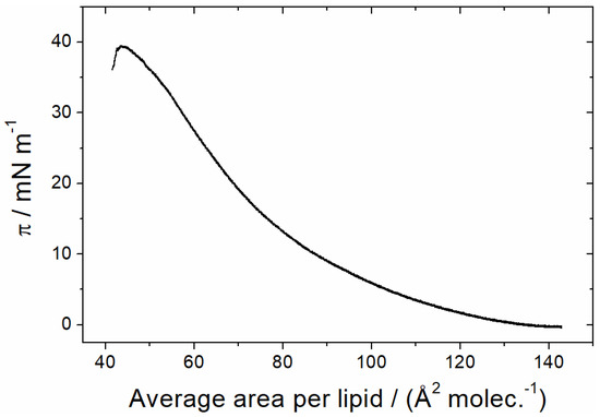 In contrast, the presence of a lipid monolayer at the interface induces the spontaneous insertion of the AH peptide into the lipid monolayer. To study the ability of AH to insert into a lipid monolayer, a lipid film was first prepared at the air–water interface of a Langmuir trough. A lipid mixture (MMM) containing zwitterionic (DOPC and DOPE) and negatively charged phospholipids (DOPS, DOPA, PI, PI(4)P, PI(4,5)P2, and CDP-DAG) as well as ergosterol, was used to mimic the lipid composition of the endoplasmic reticulum [1]. The π/A compression isotherm recorded at the air–buffer interface at 22 °C shows a liquid-expanded phase up to the monolayer collapse at 40 mN/m (Figure 4).