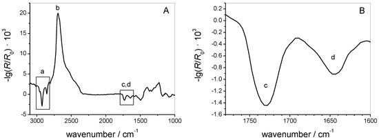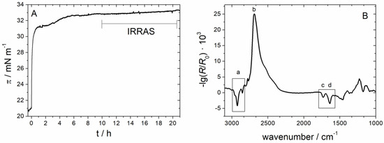 Figure 5 shows a typical IRRA spectrum of the MMM monolayer after injection of the AH peptide. The vibrational bands observed in this spectrum show that both, lipids and peptides are present at the interface. The CH2 symmetric and anti-symmetric stretching vibrations (labeled a) originate from the lipid acyl chains. Their positions (υas(CH2) = 2924.5 cm−1 and υs(CH2) = 2854.5 cm−1) are indicative of acyl chains with a high content of gauche conformers, i.e., for lipid monolayers in the liquid expanded (LE) state [49,50,51]. Therefore, we conclude that the experimental conditions are appropriate to represent the fluid state of biological membranes. Furthermore, the carbonyl stretching vibrational band (labeled c) originates from vibrations of the lipid ester groups. The presence of the amide I’ band (labeled d) shows that the AH peptide indeed adsorbed to the monolayer interface. On a H2O subphase, the amide I band would be superposed by the OH bending vibration (1600 cm−1–1750 cm−1) of the subphase water. A rather small amide I signal of a short and only weakly adsorbed peptide such as AH would not be observable. All IRRAS measurements were therefore performed on a D2O subphase, which absorbs at lower wavenumbers (OD bending: 1150 cm−1–1300 cm−1) and thereby does not interfere with the amide I’ vibrational band. (The ’ indicates that acidic hydrogens of the amide bond are exchanged by deuterium.)