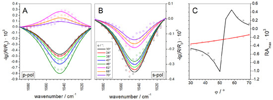 The spectra were fitted in the range of υ = 1615–1680 cm−1 and at angles of incidence, φ = 30–70° in increments of 4°, where φ = 50°, 54°, and 58° were omitted from the fit, because of low reflectivity in the range of the Brewster angle.