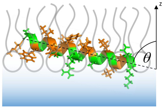 Orientation of the AH after insertion into an MMM lipid monolayer. The angle θ between helix axis (dotted) and monolayer normal (z-axis) is 77°, as determined by AoI and polarization dependent IRRA spectroscopy. The depth and the direction of insertion are proposed based on the distribution of hydrophobic (orange) and hydrophilic (green) residues and are not an experimental outcome of the IRRAS measurement. Peptide and lipid monolayer are drawn schematically and to scale.