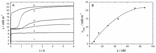 We first studied the adsorption of the isolated AH peptide to the air–water interface as a function of peptide concentration. Up to a bulk concentration of 100 nM (Figure 3A), no change in surface pressure was observed upon peptide injection, indicating that the peptide has no surface activity. This observation is surprising since amphipathic α-helical peptides usually show high surface activities, especially in subphases of high ionic strength [18,44]. However, it is unclear if, after injection into the subphase, the AH peptide readily adopts an α-helical structure or whether it is in a random conformation. Circular dichroism measurements suggest a mixture of both. As the helical structure is a prerequisite for the amphipathicity, an unfolded or only partially folded state of the isolated N-terminal peptide might explain its low surface activity at the air/water interface.