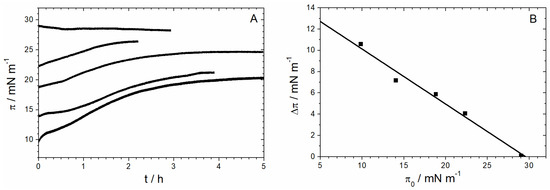 Plotting the measured increase in surface pressure ∆π against the initial surface pressure π0 usually leads to a straight line with a negative slope, which intersects the abscissa at the so-called maximum insertion pressure (MIP) [13,14,15]. It is generally assumed that a protein spontaneously inserts into membranes if this value is lower or equals the monolayer–bilayer equivalence pressure of about 30 mN/m [56,57]. When the initial surface pressure of the lipid monolayer is higher than the MIP, the protein does not spontaneously insert into the monolayer. Figure 9B shows that Sar1 has a maximum insertion pressure of 30 mN/m, which indicates that this protein spontaneously inserts into biological lipid membranes.