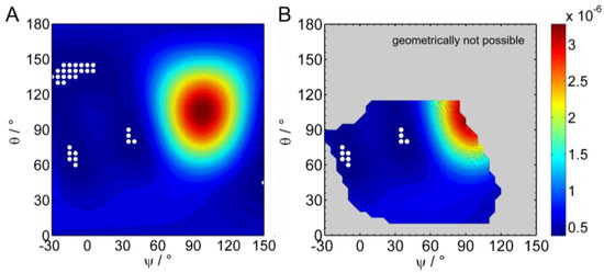 However, in the case of Sar1, the results of the spectroscopic analysis can be combined with geometrical considerations. As discussed above, the protein binds by insertion of its N-terminal AH. The protein must therefore be oriented in a way that the N-terminus of the truncated protein structure determined by crystallography (Gly24) points towards the membrane interface. Thus, all the Sar1 orientations where the Gly24 is too far away from the interface can be excluded. We therefore calculated the distance of Gly24 at every possible rotation of Sar1 (Supplementary Materials, Figure S5) and classified all orientations where Gly24 is located within 10 Å from the surface as possible orientations, all others as “geometrically not possible”. An overlay of this geometrical classification and the spectroscopic evaluation is shown in Figure 11B. Here, the error of amide I band fitting is only evaluated in the range of geometrically possible orientations. All other orientations are shown in gray. As a result, some orientations that yielded a good fit spectroscopically can be excluded by geometrical considerations, in particular the minimum around (θ, ψ) = (140°, −15°). Vice versa, the range of geometrically possible orientations is further confined by the spectroscopic analysis, as can be seen from the red areas in the range of geometrically possible orientations.