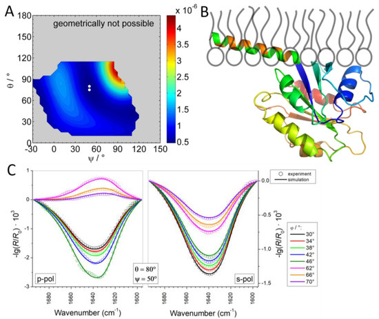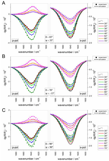 To get a visual impression of the quality and deviations of the fits in probable (blue regions) and improbable orientations (red regions), the experimental IRRA spectra are presented together with the best fitting simulated ones at three given protein orientations in Figure 12: at the two minima of the error map ((θ, ψ) = (85°, 35°) (A) and (θ, ψ) = (70°, −15°) (B)) and in an orientation that is classified as geometrically possible, but yields a bad spectroscopic fit ((θ, ψ) = (90°, 90°) (C)). Comparison of the three sets of spectra shows that the amide band shape is highly sensitive to the orientation of the protein and demonstrates the power of IRRAS as a method for determining protein orientations.