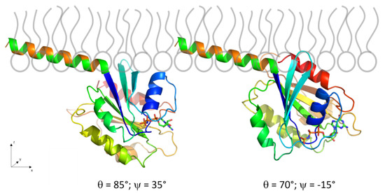 Visual comparison of the Sar1 orientation from the cryo-EM complex ((θ, ψ) = (80°, −2°),Figure 15) with the two most probable orientations of Sar1 alone activated by GTP ((θ, ψ) = (85°, 35°)) and ((θ, ψ) = (70°, −15°)), Figure 13) suggests that the Sar1 orientation within the complex is close to one of these orientations ((θ, ψ) = (70°, −15°)) and lies within a range of possible orientations of membrane-bound Sar1.