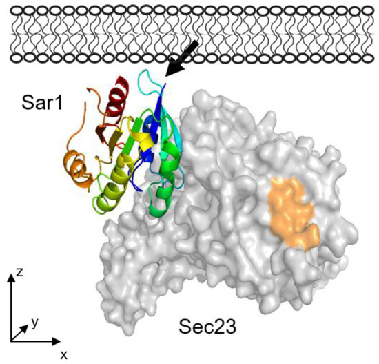 Orientation of Sar1/Sec23 within the complete COPII coat bound to a lipid membrane, as determined by cryo electron tomography [60]. The rest of the COPII coat proteins (Sec24, Sec13 and Sec31) are not depicted in this scheme. The binding site for Sec 24p is indicated in orange. The bold arrow indicates Gly24, i.e., the point of attachment of the AH membrane anchor.