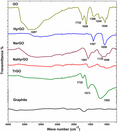 3.1. Analysis of FT-IR Spectra of Graphite, GO and Different rGOs