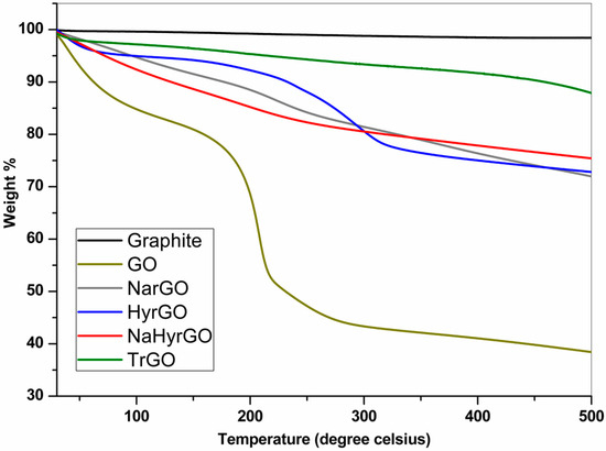 3.3. Thermal Degradation Behavior of Graphite, GO and rGOs