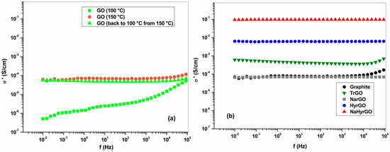 3.5. Bulk Electrical Conductivity of Graphite, GO and rGO Powders at Different Temperatures