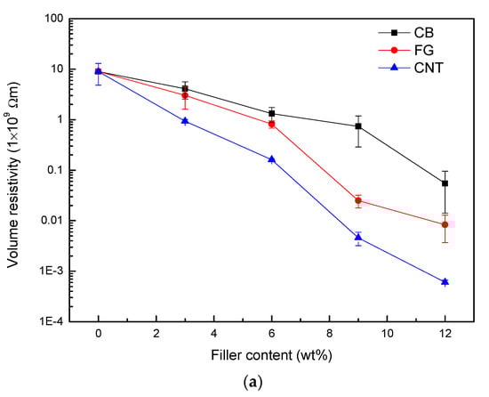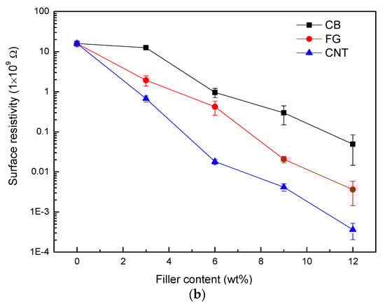 The volume and surface and resistivity values of the investigated composites are shown as a function of carbon nanomaterial content in Figure 1. The electrical resistivity of the WPCs decreased with an increase in carbon nanomaterial content. The decrease in electrical resistivity with the addition of carbon nanomaterials is due to the formation of a conductive network. With the same amount of carbon nanomaterial addition, the improvement in electrical conductivity (decreases in electrical resistivity) of the WPCs varies with the type of carbon nanomaterial used. CNTs have the best electrical conductivity, and CB has a relatively low electrical conductivity. For example, the surface resistivity of WPCs when adding 3 wt % CNTs is decreased by one order of magnitude in relation to that of pure WPCs. Remarkably, WPCs incorporating 12 wt % CNTs have a minimum volume resistivity of 6 × 105 Ω·m. Electrical conductivities of neat polymer composite-incorporating CNTs have shown higher values than those measured in this work, mainly because the presence of wood fibers obstructs the construction of conductive networks []. Compared to CNTs, the addition of 3% CB particles did not significantly affect the electrical resistivity of WPC. This phenomenon has also been observed in PMMA/CB composites []. CNT-reinforced WPCs show better electrical conductively than that of CB, because of the high length-diameter ratio of CNTs, and their good innate electrical properties []. In addition, FG platelets with large surface area can easily form conductive pathways directly in the polymer matrix, so FG platelet-modified WPCs exhibit a significantly lower electrical resistivity in small weight fractions compared to the CB particles.