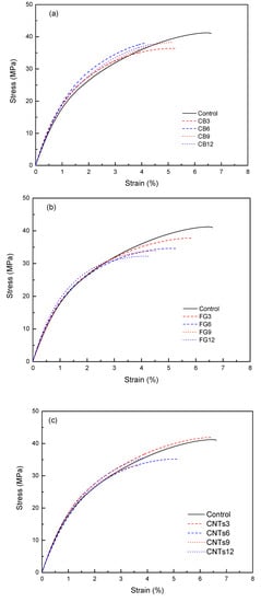 Tensile stress–strain curves of the composites. (a) CB; (b) FG; (c) CNTs.