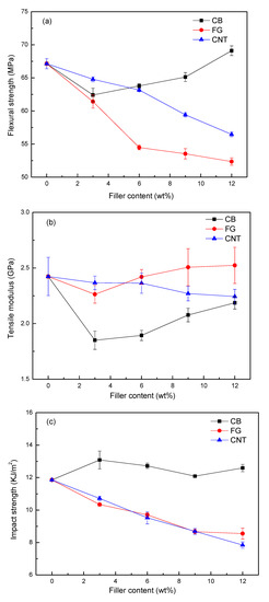 Tensile tests were conducted to examine how the addition of various amounts of carbon nanomaterials influenced the mechanical properties of WPCs. Figure 2 illustrates the stress–strain curves of WPCs containing various amounts of carbon nanomaterials, while Figure 3 presents data showing the effect of the weight fraction of the filler on the flexural strength, tensile modulus, and izod impact strength of the WPCs. For CB particle-modified WPCs, no significant influence of the amount of nanoparticles in the flexural strength and tensile modulus was found (Figure 3a,b), but an increase in izod impact strength could be observed (Figure 3c) due to the interfacial interaction between the CB particles and the PE matrix []. The flexural strength, tensile modulus and izod impact strength of WPCs with higher CNT content decreased significantly, exhibiting a different trend from that of electrical conductivity. CNTs have shown great potential for increasing tensile strength []; however, our results contradict this theory, as the successive addition of CNTs to the composite leads to a tendency for aggregation. The aggregates of CNTs in the polymer matrix may counteract any enhancements that are weakly linked, and may act as defects in the composite. When the content is increased, the filler particles tend to form larger aggregates. Thus, the reinforcement effect of fillers at higher concentrations is suppressed by the weakening effect of the large aggregates. For FG particle-modified WPCs, the flexural strength and izod impact strength decreased significantly, while the tensile modulus increased, when FG fillers were added in an amount greater than 3 wt %. The presence of FG fillers in WPCs plays a significant role in improving the strength of WPCs, but the structural defects of the WPCs lead to a heterogeneous distribution of the stress, and thus to a decline in the stiffness. The tensile properties depend largely on the interfacial interaction in the composites [].