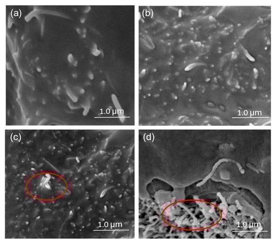 SEM micrographs of WPCs adding CNTs particles (a) 3 wt %; (b) 6 wt %; (c) 9 wt %; (d) 12 wt %.