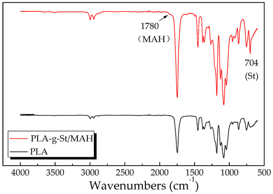 The FT-IR spectrum of PLA and PLA-g-St/MAH.