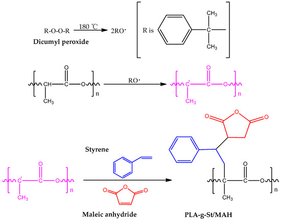 In addition, the PLA-g-St/MAH sample showed a peak at 704 cm−1 which is assigned to the asymmetric stretching vibration of the phenyl group in styrene [35,39]. No peak of C=C (1630 cm−1) was observed in either PLA or PLA-g-St/MAH. These results indicate that the unreacted MAH and St monomer were completely removed during purification. These results also confirmed that the graft copolymer of PLA-g-St/MAH was obtained by free-radical melt grafting with St as the comonomer and DCP as the initiator. The possible mechanism of the grafting reaction [36,40] is shown in Figure 2.