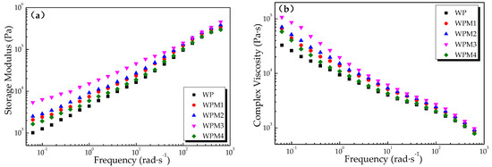 Dynamic rheological properties of the wood flour/PLA composites with different PLA-g-St/MAH loading rates: (a) storage modulus versus frequency and (b) complex viscosity versus frequency.