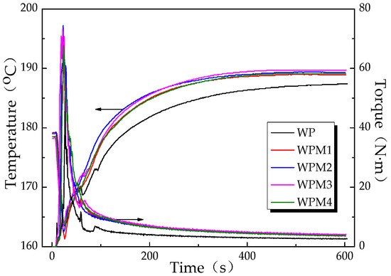 As shown in Figure 4, a rapid increase in torque occurred when the extruded pellets were added to the mixing chamber at the beginning of the tests. The reason for this was that the cold solid pellets hindered the free rotation of the rotors. As the pellets were heated and began to melt, the torque gradually dropped, owing to the combined action of heating and shearing of the rotors. The equilibrium torque, which reflects the apparent viscosity and flow properties of the molten system [43], was reached when the materials were blended evenly. The smaller the equilibrium torque, the better the flowability of the composite system. The results in Table 2 show that the Te value of the composite system increased after PLA-g-St/MAH was added, and that the WPS3 sample obtained the highest Te. This finding matched the results of the complex viscosity of the composite previously described.