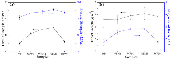 Figure 5 illustrates the mechanical properties of wood flour/PLA composites with different loading rates of PLA-g-St/MAH. As shown in Figure 5, both tensile strength and flexural strength of the wood flour/PLA composite were enhanced effectively, and reached a maximum at 3 wt % of the PLA-g-St/MAH content. Compared with the WP sample without the addition of PLA-g-St/MAH, the WPS3 sample with 3 wt % PLA-g-St/MAH content exhibited a 63.06% increase in tensile strength, 15.09% increase in flexural strength, 19.02% increase in impact strength, and 64.00% increase in elongation at break.