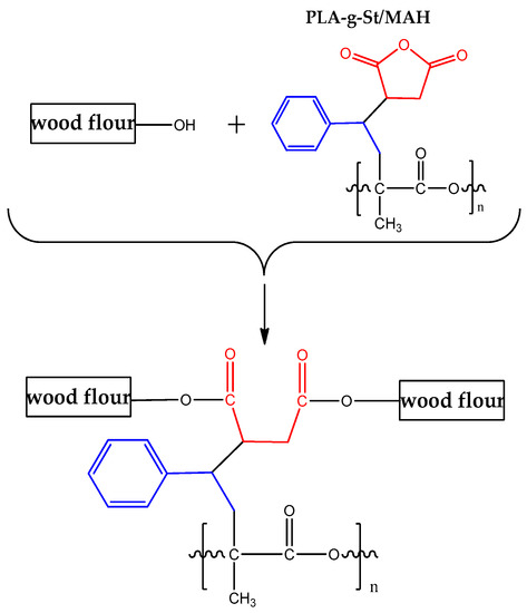 The wood flour/PLA composites with PLA-g-St/MAH showing higher mechanical properties than that without PLA-g-St/MAH proves that PLA-g-St/MAH is able to significantly improve the mechanical properties of wood flour/PLA composites. On one hand, PLA-g-St/MAH exhibited good compatibility with the PLA matrix of the wood flour/PLA composites, and lowered the surface energies of the fibers, thereby increasing its wettability and dispersion within the matrix. On the other hand, PLA-g-St/MAH had functional groups with high polarity and reactivity, which were able to be chemically bonded to the surface of the wood flour by an ester bond on one side (a possible reaction mechanism is shown in Figure 6) and combined with the PLA matrix by physical entanglement on another side [44]. In addition, MAH groups in the graft chains of the compatibilizers might also be able to react with the carboxyl groups on the PLA surface, improving the interfacial adhesion between the PLA and the wood flour. Therefore, the stress could be effectively transferred from the wood fiber to the PLA matrix, improving the mechanical properties of the wood flour/PLA composites.