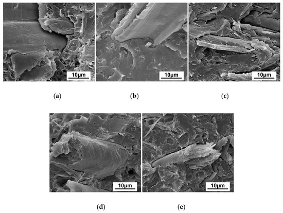 SEM micrographs of the fractured surface of wood flour/PLA composites with different PLA-g-St/MAH loading rates. (a) WP; (b) WPS1; (c) WPS2; (d) WPS3; (e) WPS4.