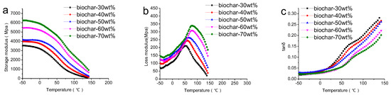 The variation of E′, E″ and tan δ of different composites with temperature under 1 Hz are shown in Figure 1. It was observed that E′ of all the composites increased with higher biochar content across the entire temperature range due to the enhanced stiffness, as can be seen from Figure 1a, which is different from WPC [30]. The reason for this phenomenon is that, when the biochar was added as rigid filler, the HDPE component was embedded in the holes of the rice husk biochar, making them more closely connected and thus improving the deformation resistance of the composites. With the higher content of biochar, the HDPE dispersion in the composite was more homogeneous and the energy storage modulus also increased. The effect of biochar content on E″ of the composites is similar to E′; it increased with increasing addition of biochar, as can be seen from Figure 1b. This meant that the damping properties of composites improved with the increase in biochar content. Figure 1c presents the corresponding tan δ curves of the composites. It is obvious that the biochar-based composites showed a lower tan δ with the increase of biochar content, which was attributed to good interactions between the filler and the mix [31]. There were no obvious peaks on the curves of the composites up to 150 °C, which was again different from WPC [32]. As the biochar content increased, the composite became more rigid, and the restriction of the polymer chains increased. This could also explain the effect of biochar content on tan δ.