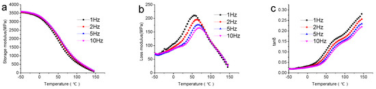 The viscoelastic properties are mainly decided by temperature, time and frequency, which means that the effect of frequency on viscoelastic properties of composites is important. The viscoelastic properties measured over a range of frequencies (1, 2, 5 and 10 Hz) are shown in Figure 2. From Figure 2a, it was found that the storage modulus of the composites increased with the increase of frequency, but the difference was very small. The effect of frequency on E″ of composites was obvious, in that the curve peak shifted to a higher temperature, although the peak width became more and more narrow with increasing frequency, as can be seen from Figure 2b. The tan δ of the composites decreased with the increase in frequency; the shape of the curve was not affected by frequency.