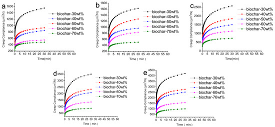 Figure 3 shows the effects of biochar content on creep behavior at different temperatures. Three stages in the creep range of 30 min were found. The first stage is the transient creep stage, at which the creep strain represents the elastic deformation of the composites. The second stage is from fast to slow, which represents the viscoelastic deformation of the composites. The third stage is the approximately straight line of the creep curve, which belongs to the viscous deformation of the composites. From Figure 3, it was found that the shapes of the five graph curves were similar, suggesting that the creep compliance decreased with the increase of the content of biochar at the same temperature. Biochar plays an increasing role in matrix composites like fibers [33], but the effect of biochar content on creep is different. The reinforcing action of the biochar reduced the creep of the matrix with an increase in biochar content, which is consistent with fiber-reinforced composites [34].