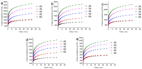 Effects of temperature on creep behavior of different composites: (a) biochar-30 wt %; (b) biochar-40 wt %; (c) biochar-50 wt %; (d) biochar-60 wt % and (e) biochar-70 wt %.